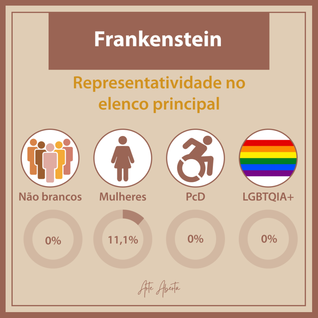 A única mulher com destaque na narrativa é Elizabeth, interpretada por Mia Goth. Os demais personagens são homens e brancos. Oscar Isaac, que interpreta Victor Frankenstein, é da Guatemala e, como homem latino, fortalece a presença de atores latinos em papéis robustos e diferentes. Entretanto, Oscar Isaac é um homem branco.