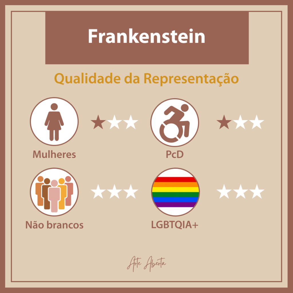 Não há, portanto, diversidade de gênero, raça e LGBTQIA+. Há um personagem com deficiência, mas ele não possui nome, apenas indicado como “homem cego”. Seu papel na narrativa é acolher A Criatura e ensiná-la a ler, além de ser um dos únicos que demonstra afeição e amor pela Criatura.