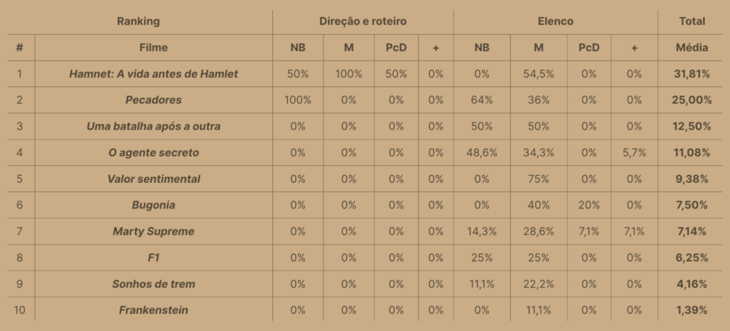 Vale destacar que o ranking considera apenas a pontuação geral nas estrelas do Teste Arte Aberta. Quando analisamos especificamente a representatividade em direção, roteiro e elenco, o filme que mais se destaca é Hamnet: A Vida Antes de Hamlet, indicado a oito categorias e vencedor do Oscar de Melhor Atriz para Jessie Buckley.